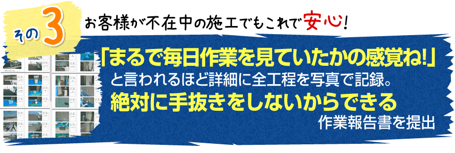 この報告書を見たお客様からは「まるで毎日の作業を隣で見ていたかのように感じますね!」と言われるくらい細かく写真や説明が書いてあります。